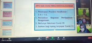 “Informasi yang kita dapatkan di kegiatan ini semoga bisa bermanfaat bagi saudara dan keluarga kita yang sedang menjalani isoman, dan bisa menjadi pelaporan sebagai kegiatan Sosialisasi SE Menag no.20 Tahun 2021 dengan titik koordinat masing-masing” Ujar Kasi Dikmad Elfa Tsuroyya, S.Ag., M.Pd.I dalam sambutannya mengawali acara sebagai Ketua Penyelenggara.