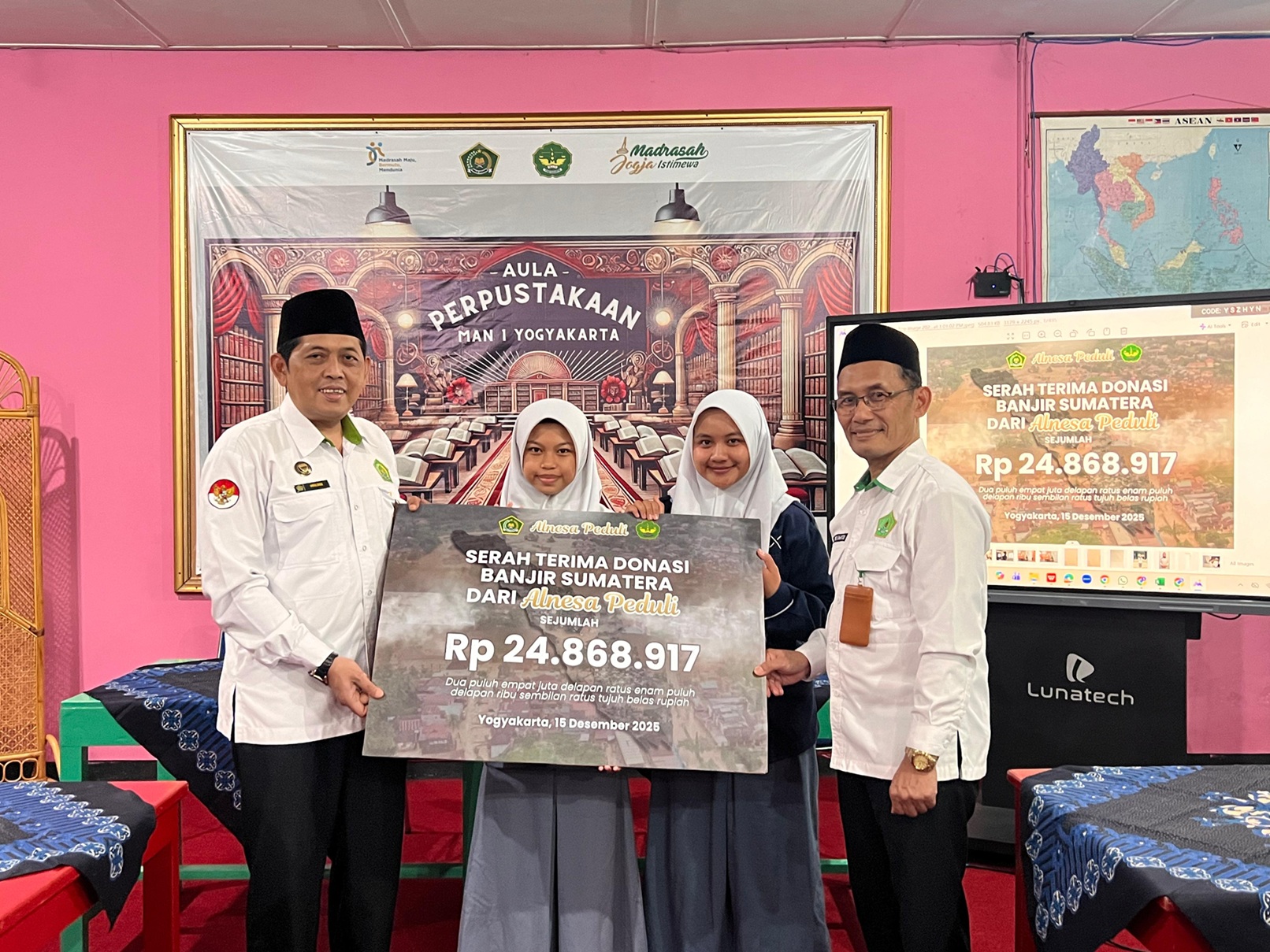Penyerahan donasi dilakukan secara simbolis oleh Ketua OSIS Nurul Jadid MAN 1 Yogyakarta Shufia Aghnia kepada Kepala Kantor Kementerian Agama Kota Yogyakarta H. Ahmad Shidqi, S.Psi., M.Eng pada Senin (15/12/2025) di aula perpustakaan MAN 1 Yogyakarta. Acara simbolisasi ini menandai tersalurkannya amanah dari para donatur kepada pihak yang akan meneruskan bantuan tersebut kepada masyarakat yang membutuhkan di wilayah terdampak. Adapun total donasi yang berhasil dihimpun oleh Alnesa Peduli mencapai Rp24.868.917. Dana tersebut merupakan hasil partisipasi berbagai pihak yang dengan tulus memberikan dukungan, baik secara materi maupun doa, demi membantu pemulihan kondisi para korban musibah di Sumatera.