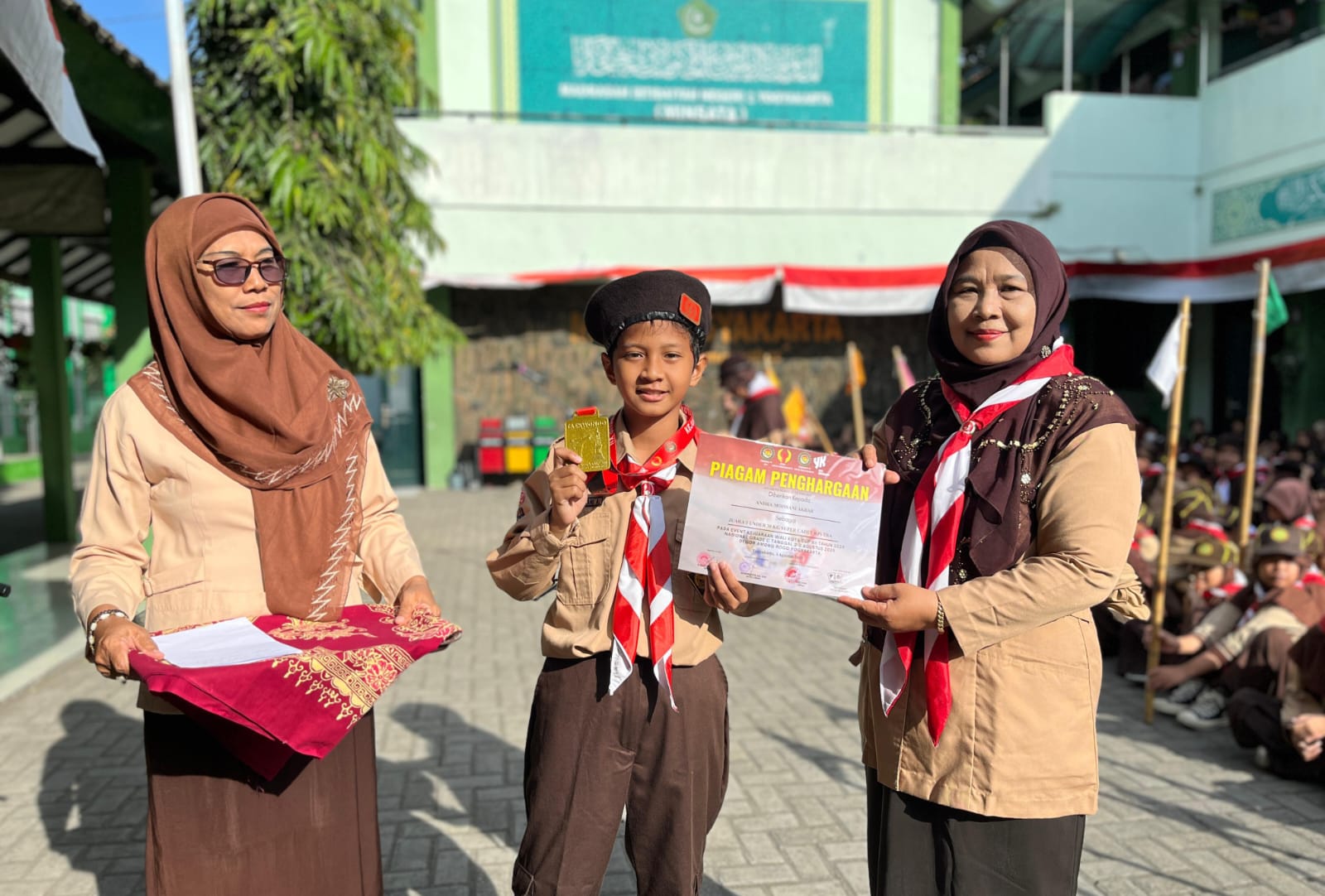 Penghargaan diserahkan langsung oleh Kepala MIN 1 Yogyakarta, Dra. Hanik Nurul Hidayah, M.SI., pada hari Kamis, 14 Agustus 2025. Prosesi penyerahan medali dan sertifikat dilaksanakan di hadapan seluruh peserta upacara Hari Pramuka di halaman madrasah, menambah semarak perayaan dan kebanggaan bagi seluruh civitas akademika.