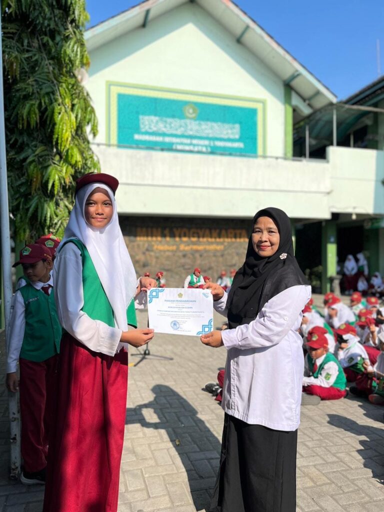 Penghargaan atas prestasi tersebut diserahkan langsung oleh Kepala MIN 1 Yogyakarta, Dra. Hanik Nurul Hidayah, M.S.I., di halaman madrasah selepas kegiatan upacara bendera pada Senin, 6 Oktober 2025.