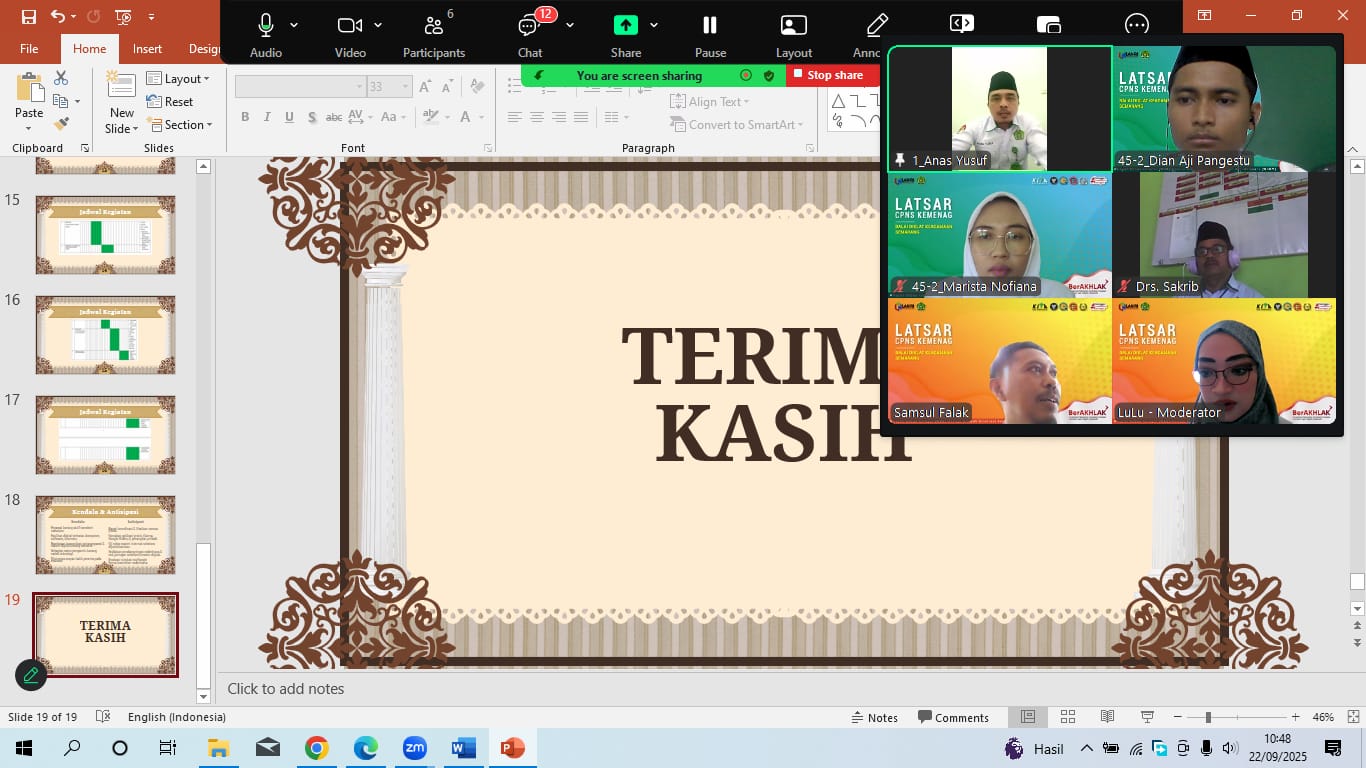 Yogyakarta (KUA Ngampilan) – Selasa, 22 September 2025, Dian Aji Pangestu, Calon Pegawai Negeri Sipil (CPNS) Penghulu di Kantor Urusan Agama (KUA) Ngampilan, melaksanakan seminar rancangan aktualisasi sebagai bagian dari latihan dasar angkatan 45 tahun 2025. Seminar RA ini dilaksanakan secara virtual menggunakan aplikasi Zoom dan dihadiri oleh Kepala KUA Ngampilan, Bapak Anas Yusuf, yang juga bertindak sebagai mentor bagi Dian Aji Pangestu. Dalam seminar tersebut, Dian mempresentasikan rancangan aktualisasinya yang berfokus pada peningkatan desain materi Bimbingan Perkawinan.