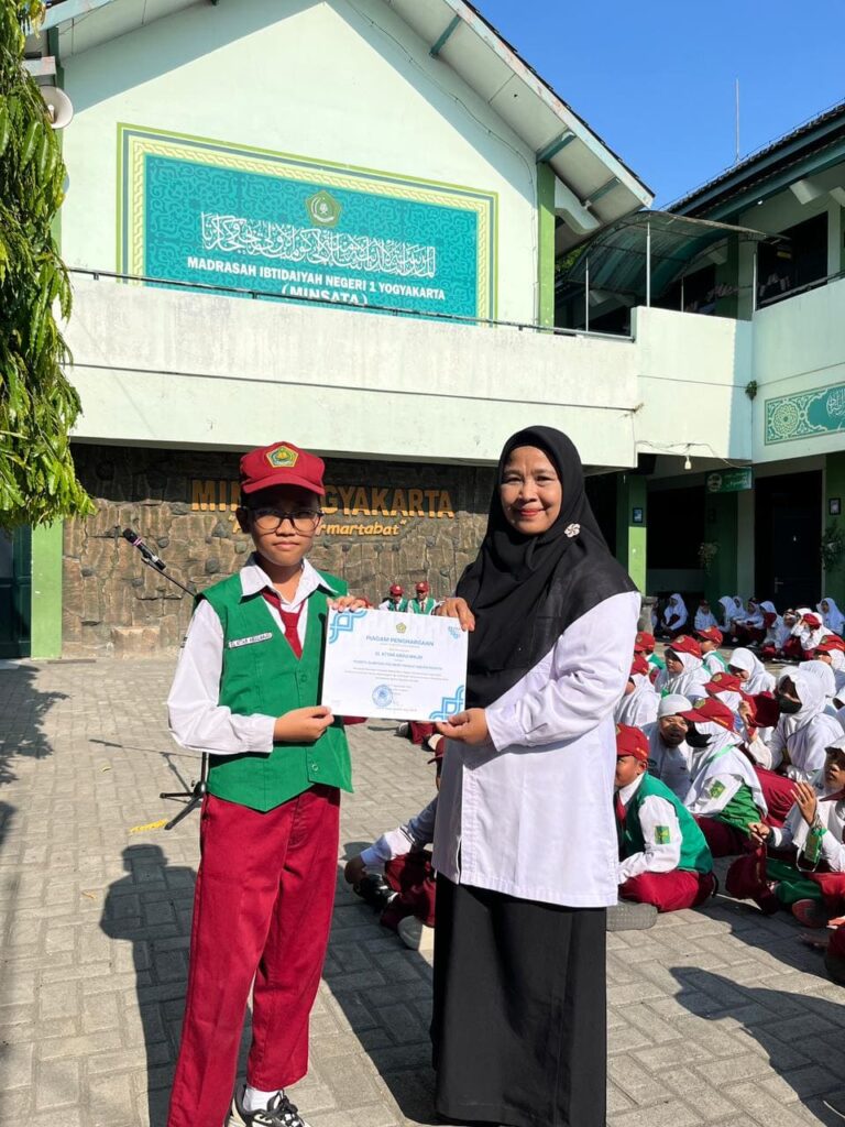 Penyerahan piagam penghargaan dilakukan secara langsung oleh Kepala MIN 1 Yogyakarta, Dra. Hanik Nurul Hidayah, M.S.I., di halaman madrasah selepas kegiatan upacara bendera pada Senin, 6 Oktober 2025.