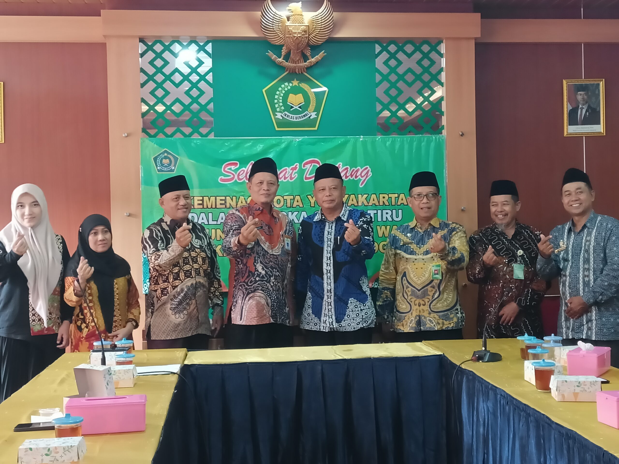Rombongan dipimpin Garazawa Suryana, S.Ag., M.S.I. disambut Kepala Kantor Kemenag Kabupaten Kulon Progo, HM. Wahib Jamil, S.Ag., M.Pd., didampingi Garazawa Haris Widiyanto, S.H. dan staf.