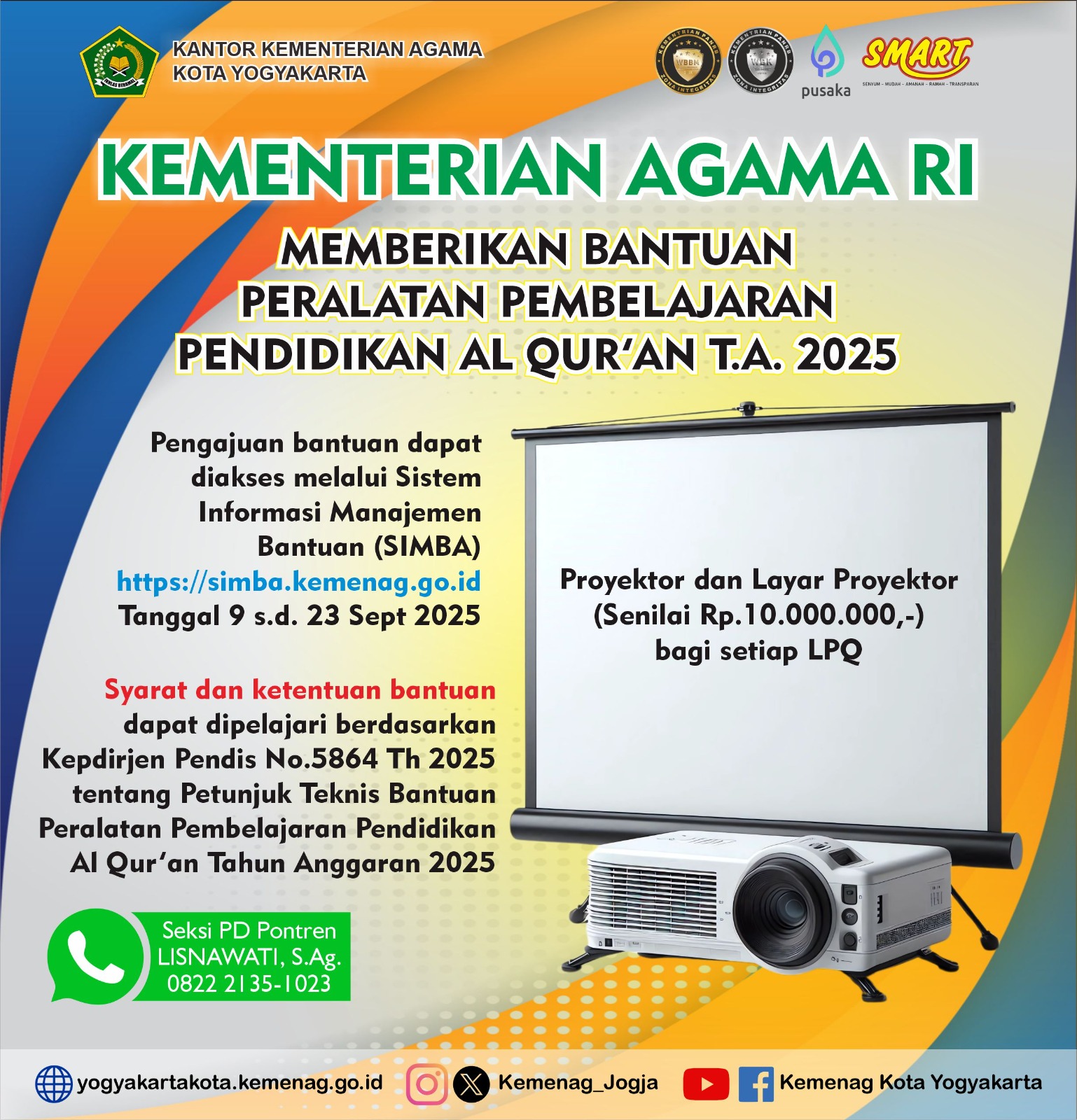 Yogyakarta (PD-Pontren) – Kementerian Agama Kota Yogyakarta melalui Seksi Pendidikan Diniyah dan Pondok Pesantren memberikan kesempatan kepada masyarakat untuk mengajukan bantuan peralatan pembelajaran dan madrasah diniyah takmiliyah.