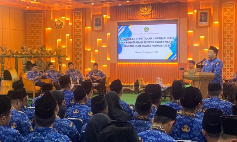 Sleman (Humas) Bertempat di MAN 3 Sleman Jl. Magelang No.km 4, Kutu Dukuh, Sinduadi, Kec. Mlati, Kabupaten Sleman, dilaksanakan Pelantikan Pegawai Pemerintah dengan Perjanjian Kinerja (PPPK) optimalisasi dan penyerahan SK PPPK Paruh waktu se- D.I. Yogyakarta, pada hari Kamis 27/11/2025.