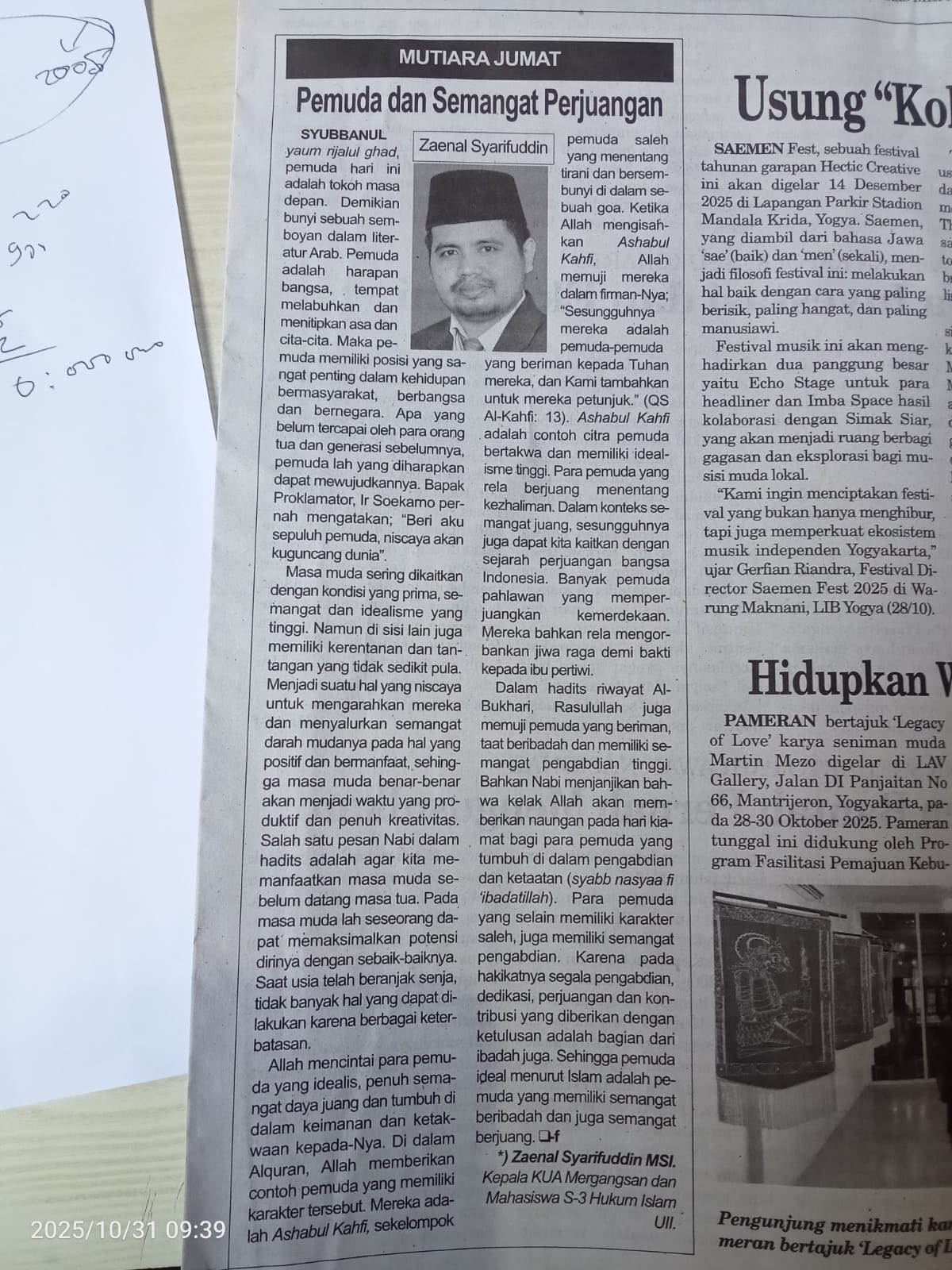 Yogyakarta – Kepala KUA Mergangsan, Jaenal Syarifuddin, S.H.I., M.S.I., kembali menulis untuk rubrik “Mutiara Jumat” di Harian Kedaulatan Rakyat edisi Jumat, 31/10/2025. Tulisan tersebut mengangkat tema “Pemuda dan Semangat Perjuangan”, dengan fokus pada pentingnya peran generasi muda dalam kehidupan berbangsa dan beragama.