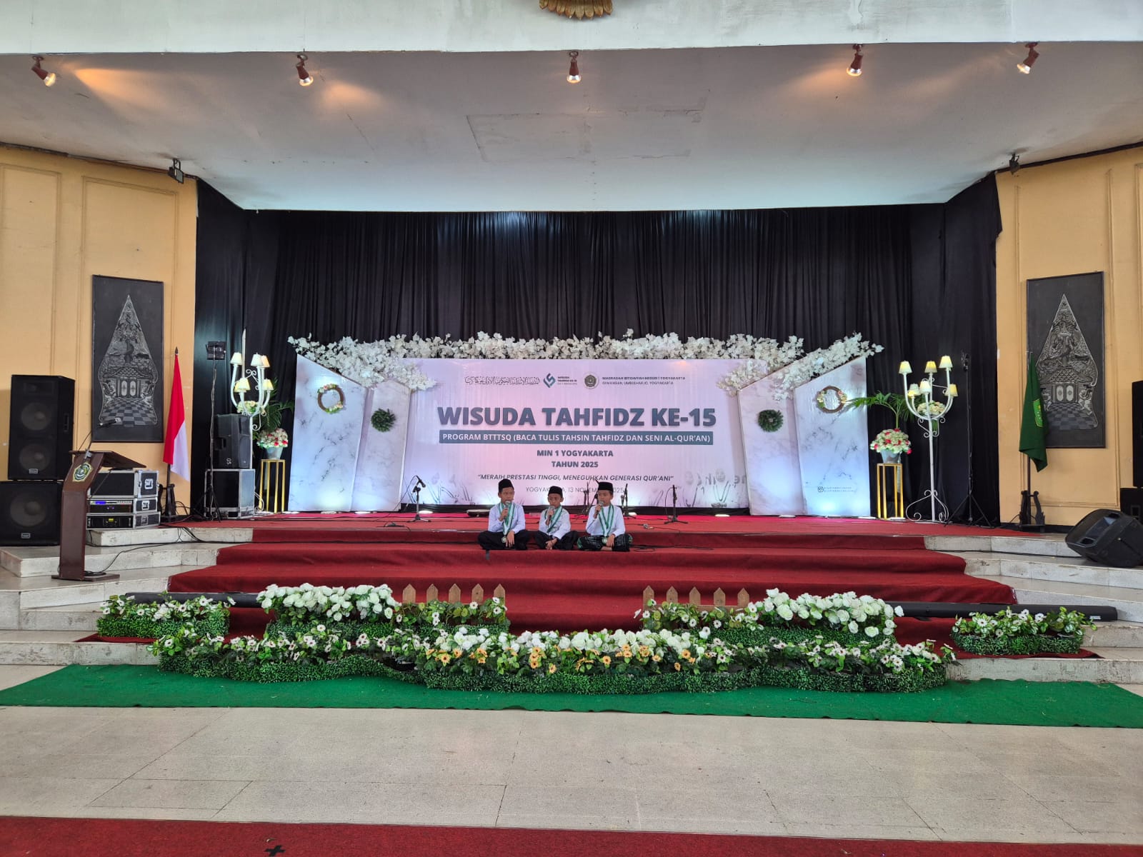 Menarik perhatian seluruh hadirin, ketiga siswa tersebut mengambil posisi di tengah panggung utama. Tanpa kursi atau mimbar, mereka duduk bersila dengan tenang, menunjukkan fokus dan kesiapan mereka.