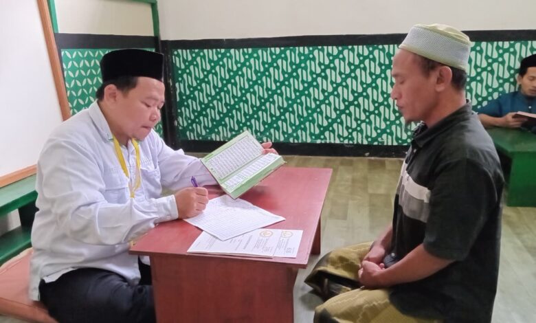 Yogyakarta — Penyuluh Kantor Urusan Agama (KUA) Mergangsan, Ali Hafidh, memberikan bimbingan Madrasah Diniyah Al-Qur’an (MDA) dengan metode menyimak setoran hafalan kepada warga binaan di Lembaga Pemasyarakatan (LP) Kelas 2 Kota Yogyakarta, Selasa (27/1/2026).