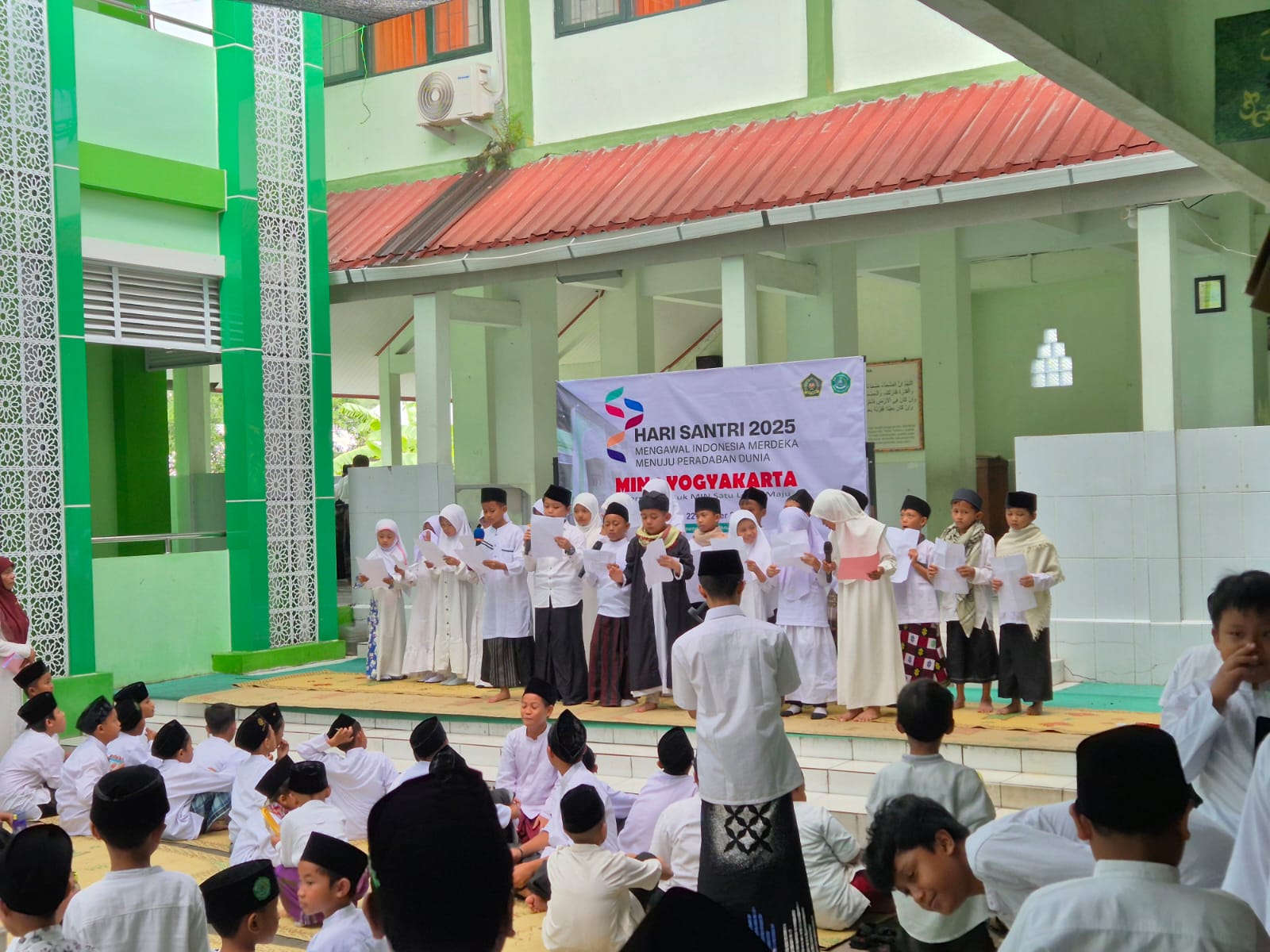 Yogyakarta (MIN 1 Yogyakarta) — Perayaan Hari Santri Nasional 2025 di Masjid Bustanurrasyid MIN 1 Yogyakarta berlangsung meriah dan sarat makna. Salah satu penampilan yang paling memukau perhatian adalah pembacaan puisi bersama dari para peserta ekstrakurikuler Literasi Bahasa Indonesia, yang tampil dengan penuh penghayatan pada pukul 09.10 WIB hingga selesai.