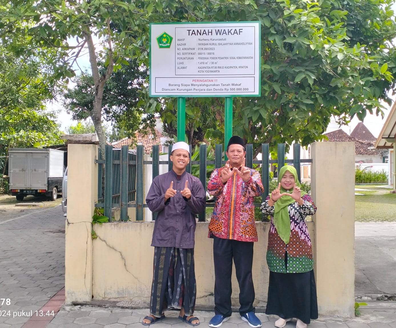 Yogyakarta (KUA Kraton)-Penyelenggara Zakat Wakaf Suryana, S.Ag.M.S.i melakukan program papanisasi tanah wakaf. Salah satunya dilaksanakan pada Kamis, 11/07/2024 di Lokasi Tanah Wakaf Ponpes Yayasan Nurul Ishlahiyyah Kraton. Dalam kegiatan tersebut Suryana didampingi oleh Penyuluh Agama Siti Khotijah sekaligus perwakilan dari KUA Kraton.