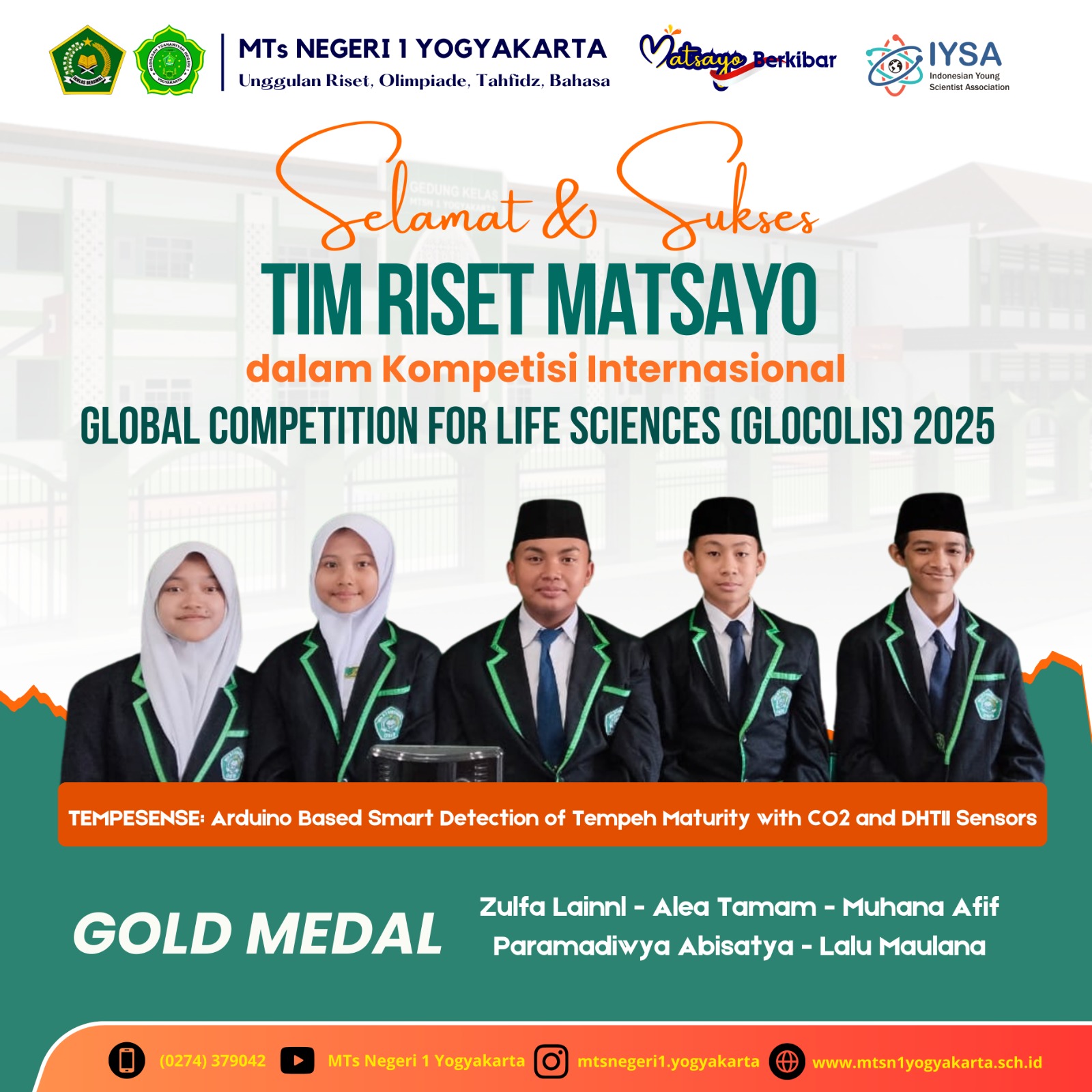 Yogyakarta (MTsN 1 Yogyakarta)-Prestasi gemilang kembali diraih siswa MTsN 1 Yogyakarta. Tidak tanggung-tanggung, kali ini level internasional sukses ditembus oleh 5 siswa berprestasi pada ajang riset internasional Global Competition For Life Sciences (GLOKOLIS) 2025. Kelima siswa tersebut, yaitu Zulfa Lainun Adha, Alea Tamam Zanuri, Muhana Afif Fada Isyadana, Paramadiwya Abisatya Putra, dan Lalu Maulana Malik. Mereka mengangkat judul penelitian “Tempesense: Arduino Based Smart Detection of Tempeh Maturity With CO2 and DHTII Sensors”. Atas prestasi ini, siswa MTsN 1 Yogyakarta berhasil meraih medali emas pada kompetisi riset yang diadakan Indonesian Young Scientist Association (IYSA).